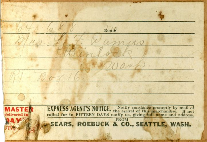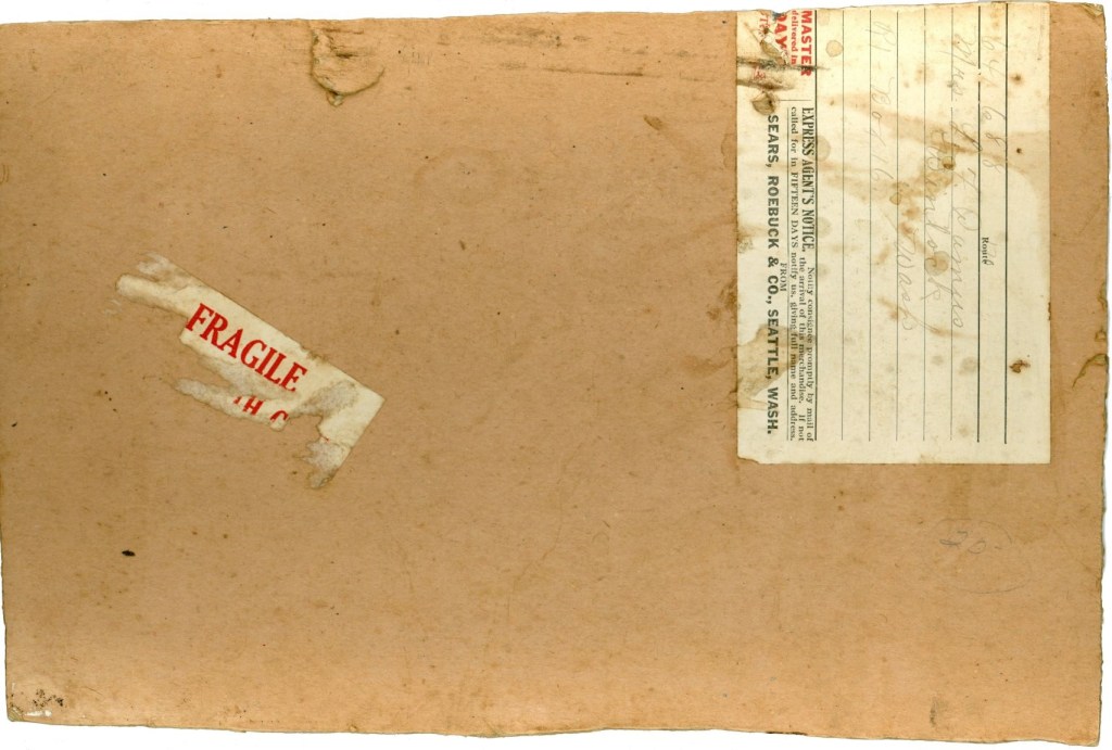 Sent from the Sears warehouse in Seattle, this “fragile” item made its way on delivery route 170 to the home of Mrs. L. F. Pamus (maybe – the handwriting on this label is a good reminder of how well off we are today with printed labels), of Winlock, Washington.
