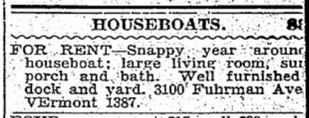 Newspaper ads confirm it: 3100 Fuhrman Ave was a houseboat publicly advertised for rent several times in the 1920s and 1930s. Who wouldn’t want to live in a “snappy” houseboat?