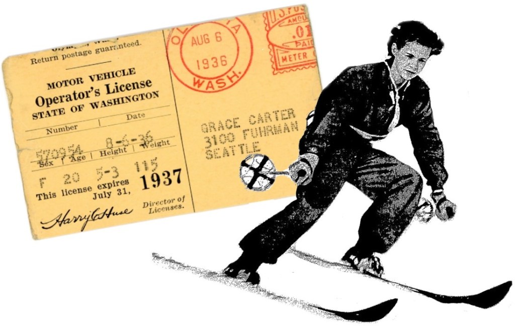 Who was Grace Carter? At the time this license was issued to her, she was one of the top, pioneering downhill skiers in the Pacific Northwest. Only months before this license was issued, she had just returned from Europe, where, at the age of 19, she represented the United States at Hitler’s Olympics.