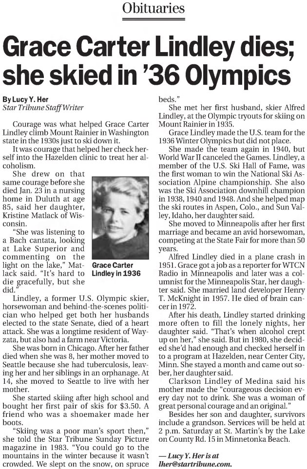 Skiing remained a part of Grace Carter’s life after her European journeys, but the Pacific Northwest didn’t. In April 1937 she married fellow Olympic team skier Al Lindley (who had also been an Olympic rower, crewing for Yale and winning a gold medal at the 1924 Olympics) and moved with him back to his native Minnesota, where she would live the rest of her life.