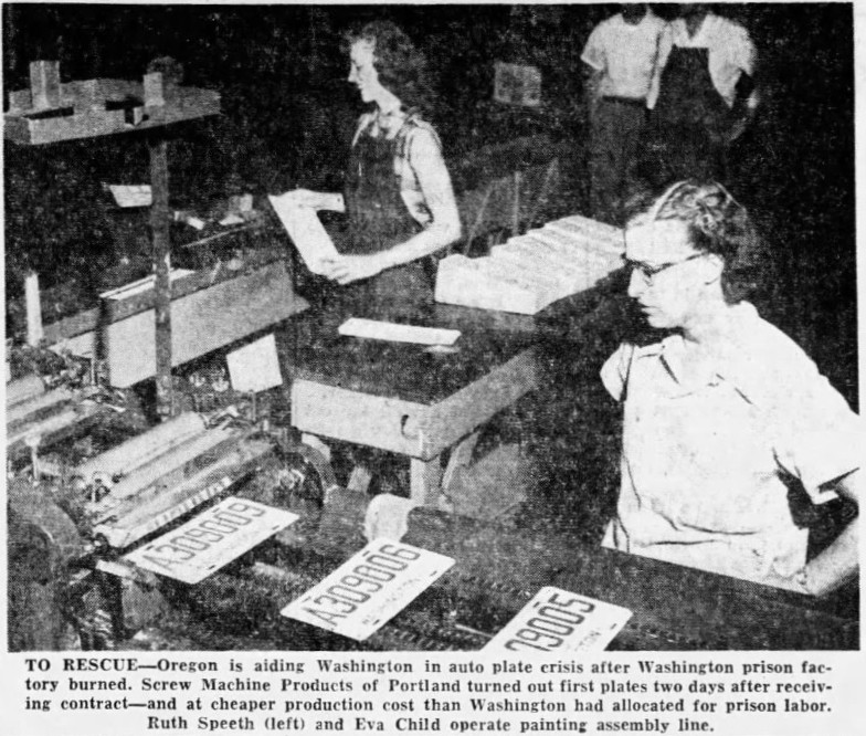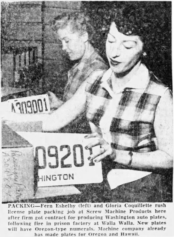 By the morning after the fire, the state already had leads. “Acting Governor Emmett Anderson said a Boston firm has notified the state it can provide up to 10,000,000 plates within 60 days. But he didn’t know how much the firm would charge” (Spokane Chronicle, September 10, 1953). Two days later, state motor vehicle administrator A.J. Thomas, visiting Spokane, told the Spokesman-Review that the state had leads on private suppliers in Oregon and Kansas. The very next day, it was reported that the state had “completed negotiations with two private plants in Oregon and the department of corrections in California to complete the plates.”