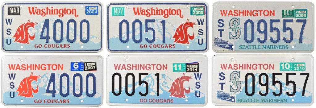 The example above shows three sets of plates. At left, Washington State University #4000. The top plate would have been issued in 1997. When it came up for replacement in 2004, the design had evolved to the offset block-letter state name sans embossed border. The second WSU plate, number 0051, was issued in 1999 (the WSU logo was moved to the right after number 9999 was issued in the original format; numbering started over again with the logo as a suffix to create a new series), and by the time its replacement was mandated in 2006, all optional designs had gone to a flat manufacturing process. Thus, its reissue is flat. The same fate befell the Mariners plates to the right.