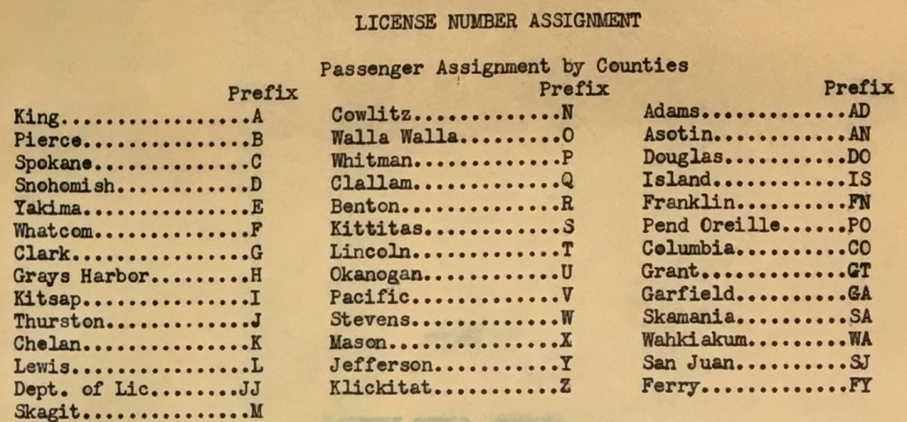 For many years, when Washington’s license plates were county-coded, such car-spotting could be done at an in-state level. Those who noticed or cared about such things could take great interest if an AN (Asotin County) showed up at the opposite corner of the state in Cape Flattery, if an islander sporting an SJ prefix (San Juan County) had made the effort to take a ferry to the mainland, or if one of them big-city folks with an A prefix (King County) was driving around the remote forests of Pend Oreille County. When county-coding was introduced to Washington’s license plates in 1935, matchbooks, postcards, and roadmaps were soon available listing the codes for all of the state’s 39 counties, which ranged from A to Z with 13 additional two-letter codes for the smallest counties.