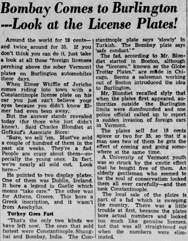 Canadians were just as game for the plates. In Saskatchewan, “curbstone observers were properly impressed the other night when they noticed a sleek new car parked nearby bearing license plates of Egypt and ‘Republique Francaise’ in addition to Saskatchewan plates. Came a cynic who examined the plates more closely, looked on their rear surface. Pasted thereon were paper slips, advertising ‘Globe-Trotter Plates…Put Some on YOUR Car.'” (The Leader-Post, June 19, 1939).