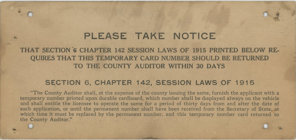 The motor law of 1915 stated that “the County Auditor shall, at the expense of the County issuing the same, furnish the applicant with a temporary number printed upon durable cardboard, which number shall be displayed always on the vehicle and shall entitle the licensee to operate the same for a period of thirty days from and after the date of such application, or until the permanent number shall have been received from the Secretary of State, at which time it must be replaced by the permanent number, and the temporary number card returned to the County Auditor.”
