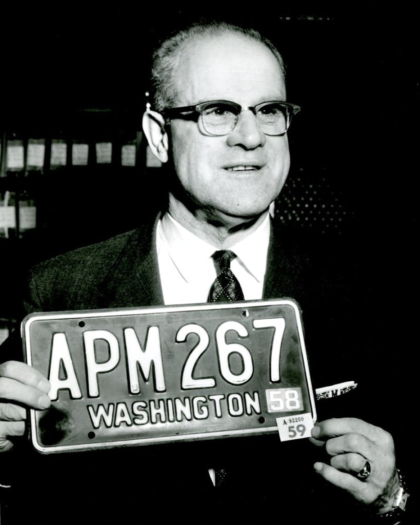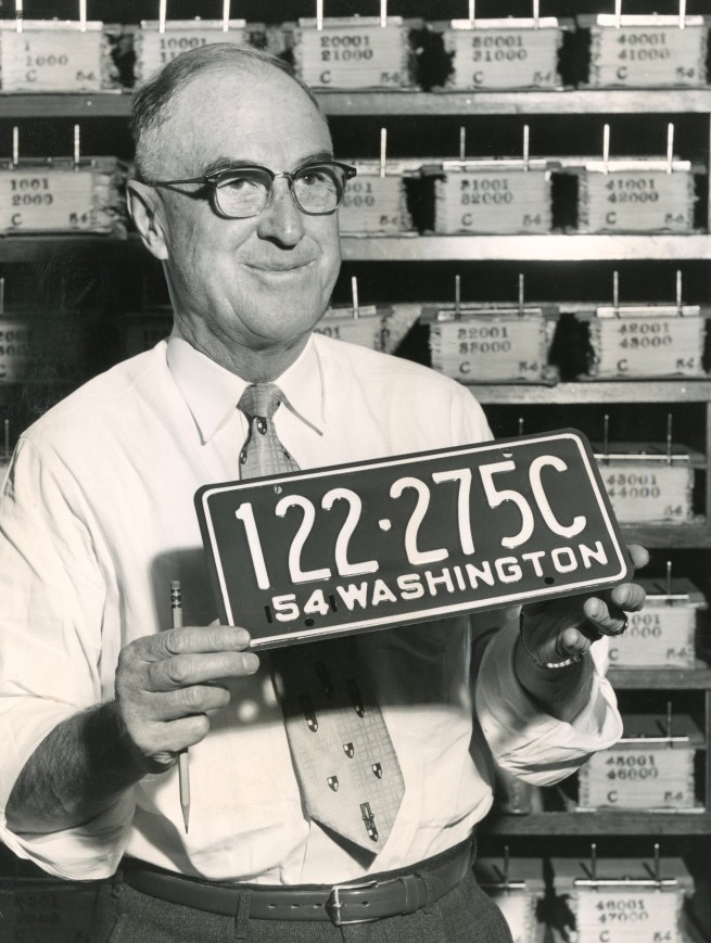 An additional complication arose late in 1954. The decision to issue only a single plate for the rear of the vehicle had been controversial from the start, but trouble identifying a bank robber’s getaway car in Seattle was the tipping point for public outrage and law enforcement pushback, and at the end of 1954 the Department of Licensing acquiesced to demands for front license plates. This required an enormous effort to manufacture a second plate for every number and ship it to registrants across the state. A 1957 state audit deemed it a fiasco, costing taxpayers a quarter of a million dollars from inefficiencies and disorganization, with improper records resulting in thousands of plates being mailed to incorrect addresses and returned to state offices multiple times.