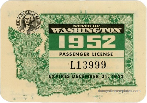 Because of ongoing metal shortages, the state would again turn to windshield stickers for the 1952 licensing year, the final time they would be used in Washington. This time, they were issued in pairs: one for the windshield and one for the rear.