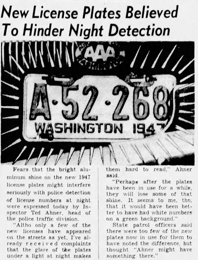 Immediately after 1947 plates began appearing on the road, numerous complaints poured in about the bright reflection they generated.