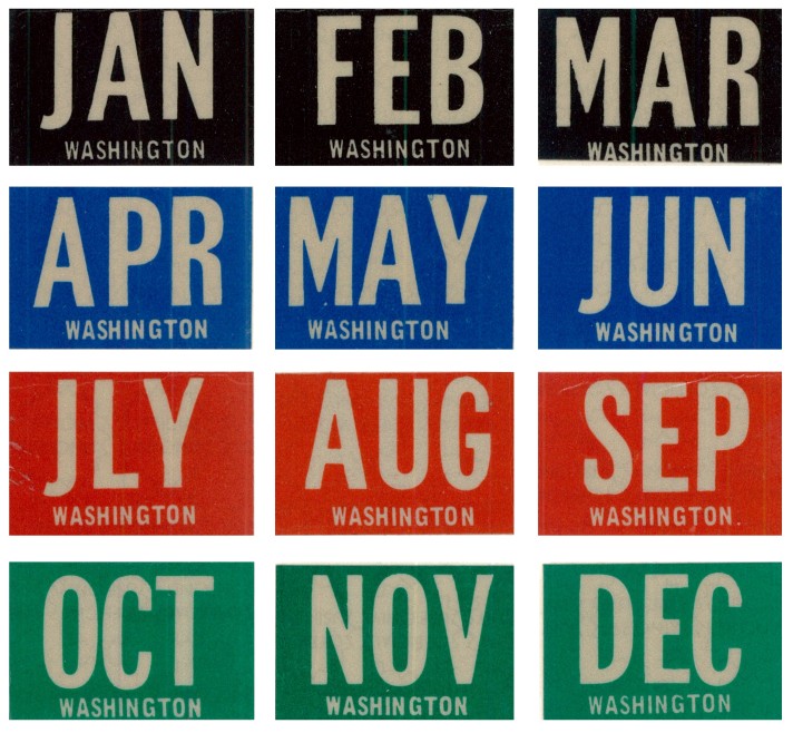 Shortly after Evergreen State design debuted, month stickers were updated to replace the three-letter month abbreviation with a month number (e.g. “JAN” and “FEB” became “1” and “2”, etc.).