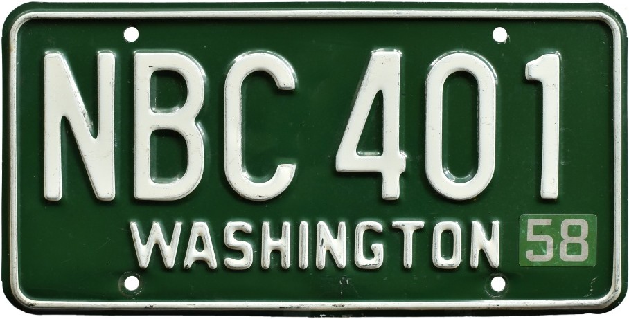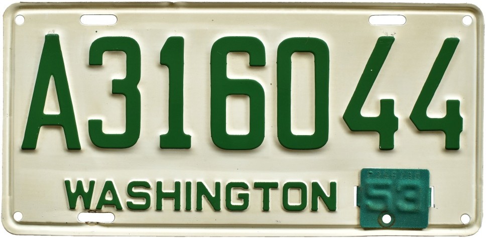 Washington’s current license plate system, with alphanumeric serials and annual renewals marked with adhesive stickers, originated with the 1958 issue.