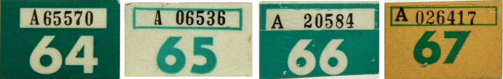 1953 saw the 1950 and 1951-dated plates renewed with dated ’53 tabs, issued only to the rear license plate. By 1953, a typical car would have 1950-dated license plates, with a green 1953 tab on the rear, a leftover 1951 tab on the front, and leftover 1952 windshield stickers in the windows (or the remnants of unsuccessful attempts to scrape them off).